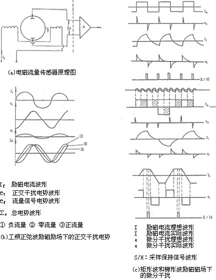 工頻干擾噪聲是由電磁流量傳感器勵磁繞組和流體、電極、放大器輸入回路的電磁耦合,另外分體式電磁流量計工作現(xiàn)場的工頻共模干擾,其三供電電源引入的工頻串模干擾等,其產(chǎn)生的物理機理均是電磁感應原理。首先就電磁流量傳感器勵磁繞組和流體、電極、放大器輸入回路的電磁耦合產(chǎn)生的工頻干擾對分體式電磁流量計工作影響最大,而且在不同的勵磁技術下其表現(xiàn)的形態(tài)、特性不同,因而采取抗干擾措施也不同,如圖1所示在各種勵磁技術。