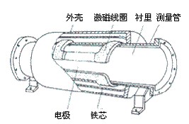 防腐型電磁流量計(jì)由傳感器和轉(zhuǎn)換器組成。而傳感器主要組成部分是:測量管、電極、勵(lì)磁線圈、鐵芯與磁軛殼體。傳感器安裝在測量管道上,轉(zhuǎn)換器可以與傳感器組合連接在一起稱為一體型電磁流量計(jì),轉(zhuǎn)換器被安裝在離傳感器30米內(nèi)或100米內(nèi)的場合,兩者間由屏蔽電纜連接稱為分體式電磁流計(jì)。